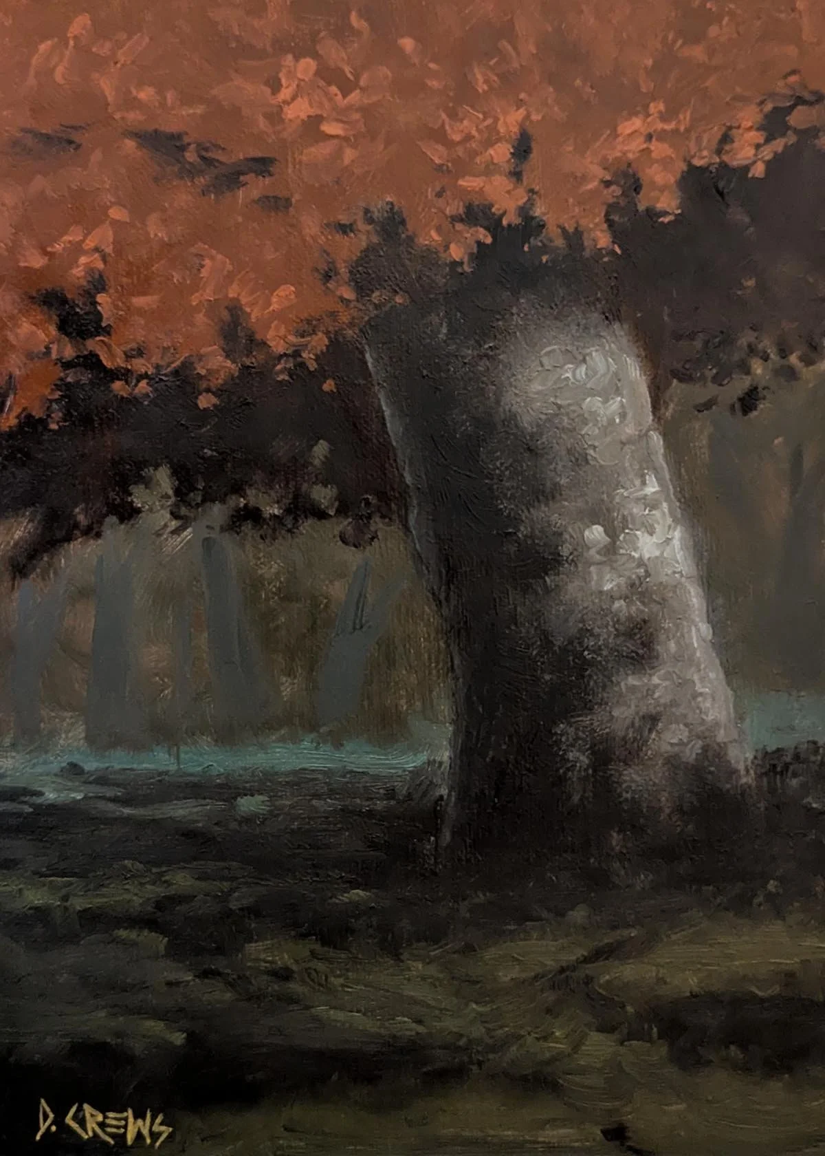 Two small tree studies painted from imagination. The first is 6 x 9” and the other is 5 x 7”. Both painted in oil on linen mounted on panel.